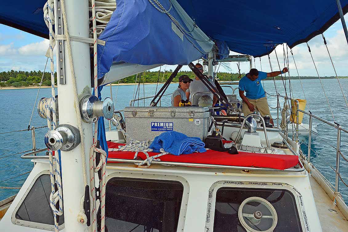 Acht Uhr Frühstück, dann geht es zur Tauchstation, um Schnorchelausrüstung entgegen zu nehmen. Matt, ein Australier und seine Frau Joan, eine Neuseeländerin, bringen uns fünf Gäste auf sein 12-Meter-Segelboot. Sie wollen uns die Tonga-Wale zeigen, die sich in der Antarktis vollgefressen haben und nun im Winter in dieser Bucht ihre Jungen zur Welt bringen und ihnen die ersten Schwimmbewegungen beibringen. Walbabies bewegen sich noch sehr unbeholfen und müssen viel lernen, vor allem aber alle vier Minuten Luft holen, da ihre Lungen noch nicht so groß sind. Auch ihr Blubber ist noch sehr dünn, daher trinken sie pro Tag 500 Liter Milch an der Mutterbrust, um eine dicke Isolierschicht zu bekommen.