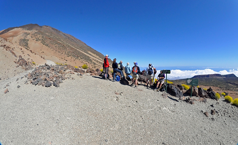 Also geht es los. Erst schön gemütlich über einen Schotterweg - dann immer steiler einen Pfad durch das Lavageröll bergauf, immer steiler, immer rutschiger, wir sind schon weit über der Wolkendecke und haben einen wunderbaren Blick auf die Vulkanlandschaft des Teide. Die immer heiß er werdende Sonne und die mit zunehmender Höhe abnehmende Temeratur gleichen sich gerade aus! Hab ich ein Glück!