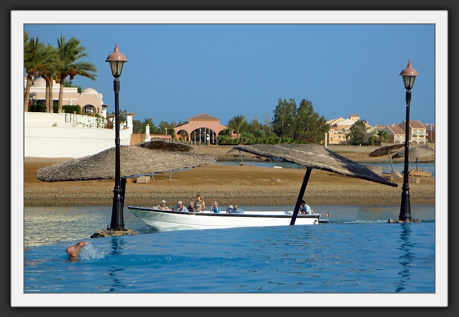 Mein Hotel liegt lagunenmäß in der zweiten Reihe vom Meer aus gesehen. Mit einem regelmäßig verkehrenden Shuttle-Boot kann man sich aber zu einem hoteleigenen Strand direkt am Meer hinüberschippern lassen, der in wenigen Minuten erreicht ist.